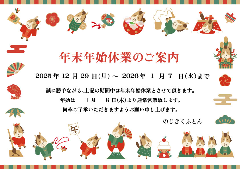 2025年12月29(月)~2026年1月7日(水)まで誠に勝手ながら、上記期間中は年末年始休業とさせたいただきます。 年始は1月8日(木)より通常営業いたします。何卒ご了承いただきますようお願い申しあげます。